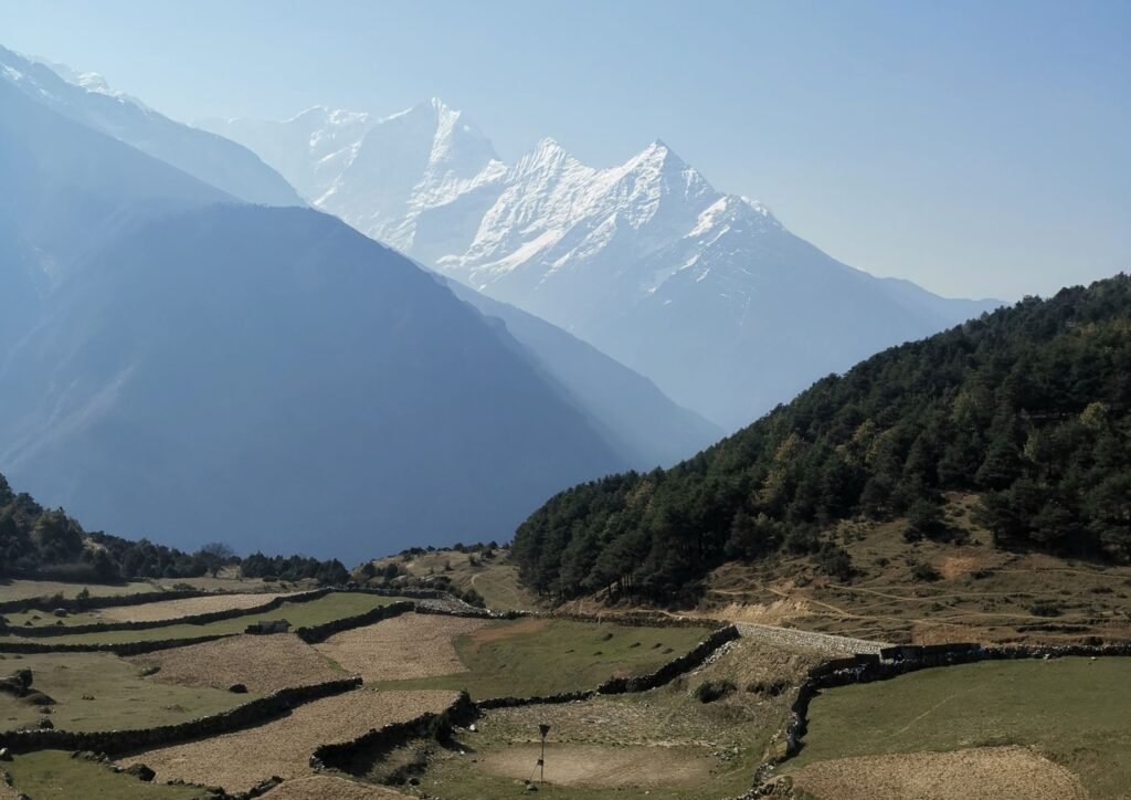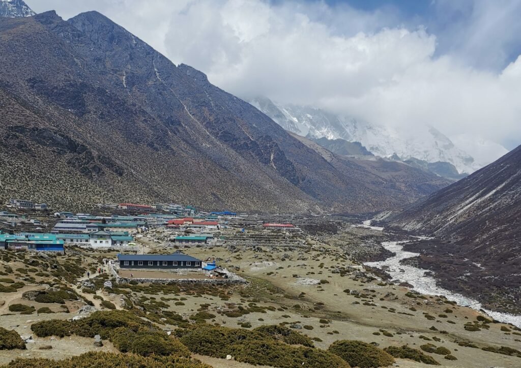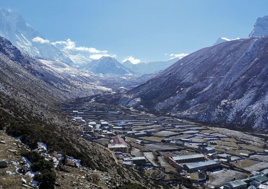 Nous descendons à travers une forêt avant de traverser la rivière Imja Khola et d’atteindre Pangboche, le plus grand village sherpa de la région. Après le déjeuner, le sentier monte progressivement à travers les moraines glaciaires et les pâturages de yaks jusqu’à Dingboche (4 375 m), où l’altitude commence à se faire sentir.