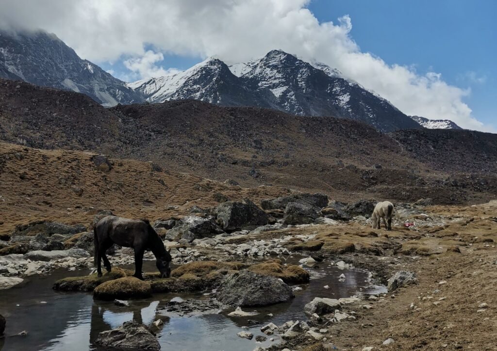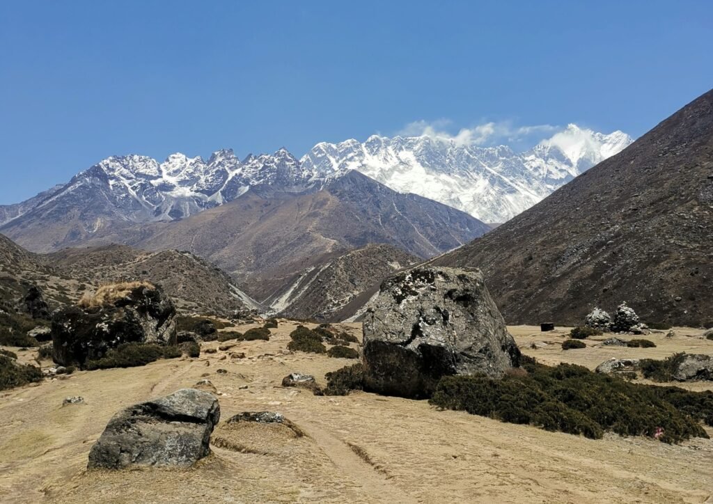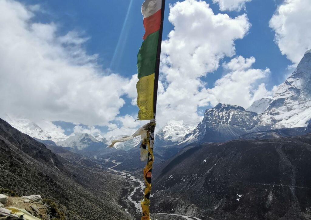 À partir de cette étape, l’altitude se fait vraiment sentir et la marche devient vraiment difficile ! Premier signe de mon côté du mal de l’altitude et les maux de tête qui vont avec…Après une pause à Dughla, nous attaquons une montée plus raide jusqu’au col du Dughla Pass, où se trouvent plusieurs mémoriaux dédiés aux alpinistes disparus sur le Mont Everest, passage vraiment émouvant. Ensuite, le sentier longe le glacier du Khumbu jusqu’à Lobuche (4 900 m), avec de superbes vues sur les sommets environnants.