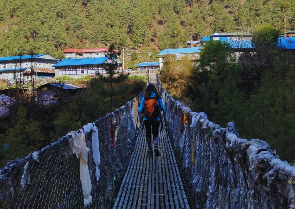 Cette journée marque le début des choses sérieuses. Dès les premières minutes, on traverse les fameux ponts suspendus (sensations garanties si vous avez le vertige). Le sentier alterne ensuite entre forêts, villages sherpas et montées. On entre ensuite dans le Parc national de Sagarmatha avant de rejoindre Jorsale pour le déjeuner. L’après-midi est plus intense, surtout après le grand pont de Larja Doban où commence la montée vers Namche. Puis, après environ 1 h 30 d’effort, on découvre enfin la première vue sur Mont Everest, un moment assez magique qui fait vite oublier la fatigue.